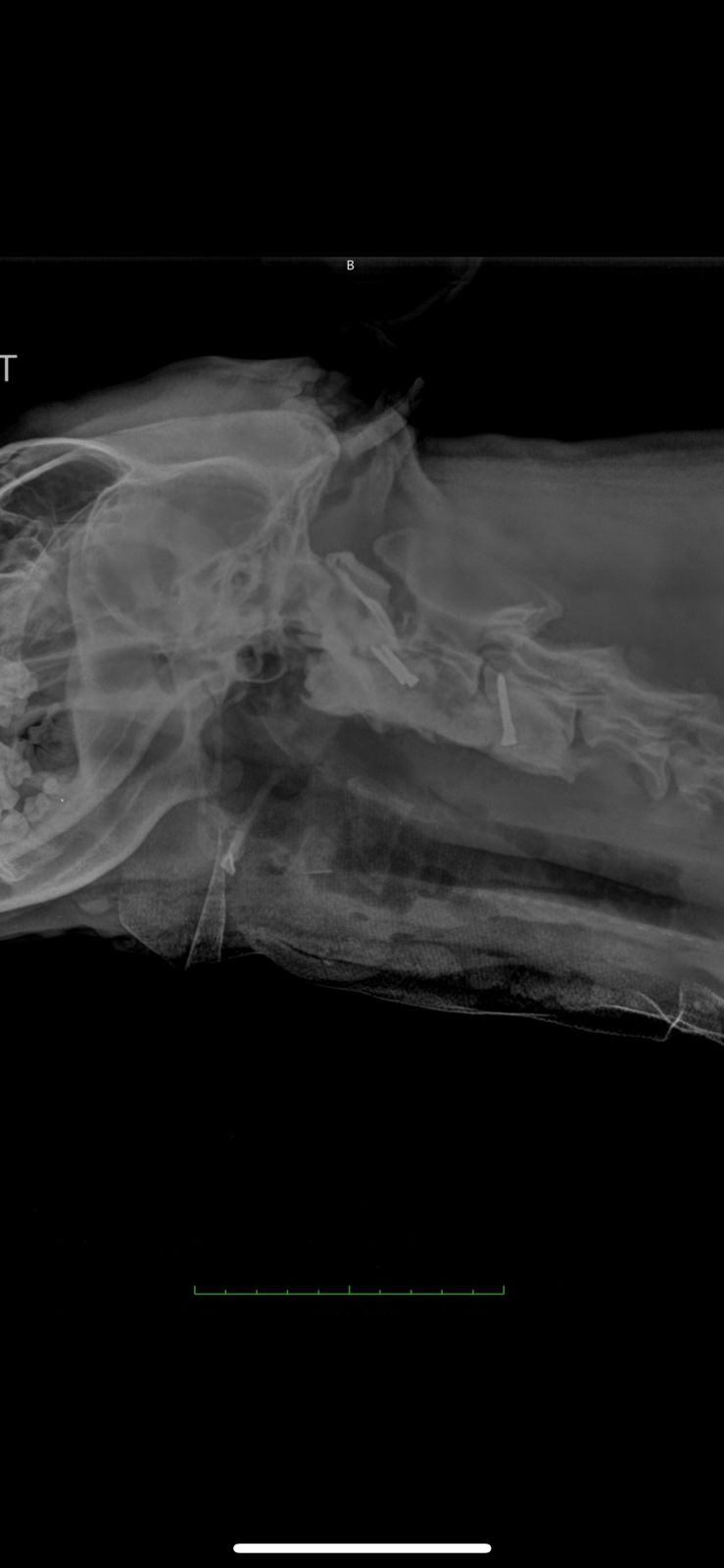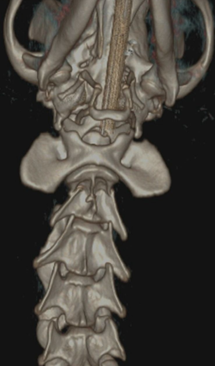 A thorough neurological examination followed by a CT scan revealed a C2 vertebral fracture with severe spinal cord compression along with a scapular fracture. Woody also experienced intense pain when flexing his neck. Given the risk of permanent damage, the surgical team decided to proceed with an advanced spinal fixation procedure using screws and PMMA.